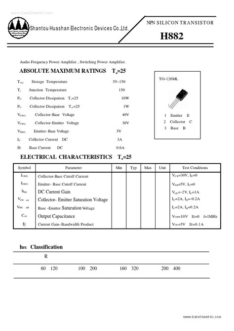 h882 transistor datasheet pdf Part #: H882. Download. File Size: 751Kbytes. Page: 3 Pages. Description: NPN SILICON TRANSISTOR. Manufacturer: SHANTOU HUASHAN ELECTRONIC DEVICES CO.,LTD.